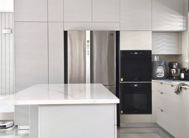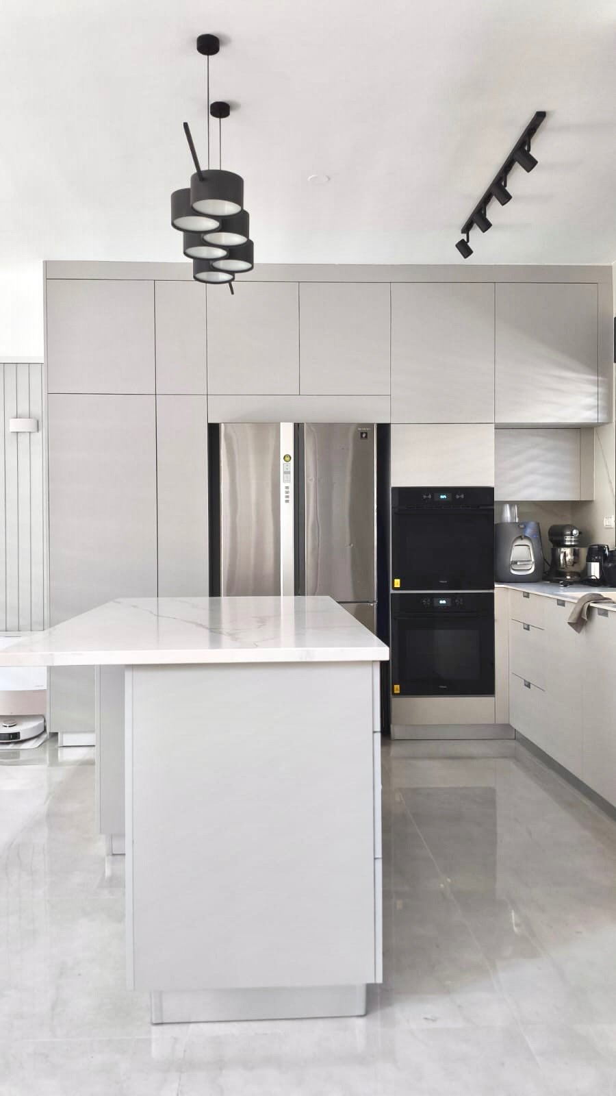 מטבח אפור בהיר, מט ומדויק ששומר על רוגע ומודרניות.
