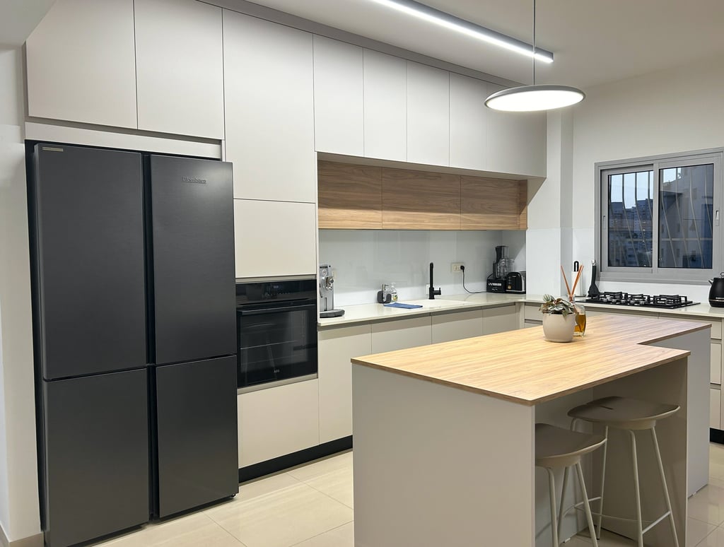 מטבח ננו אקרילי עם אי המשלב גווני סהרה ועץ בהיר.