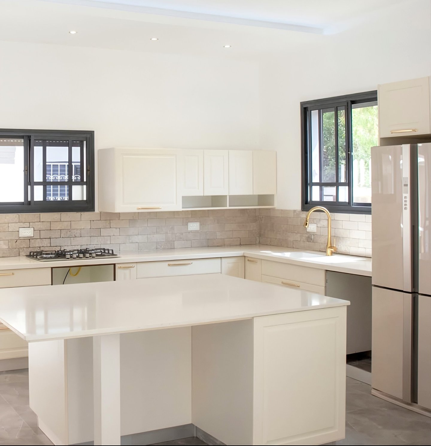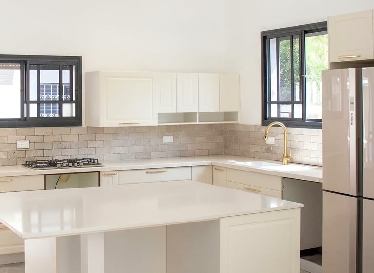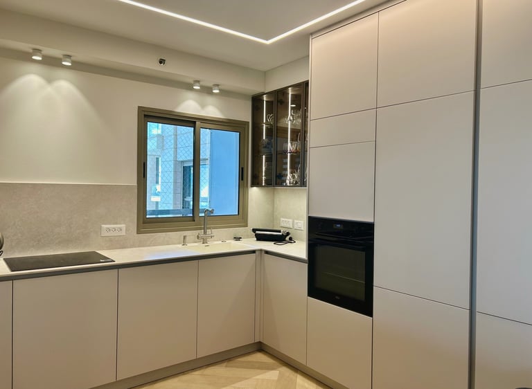 מטבח מודרני עם ארון זכוכית בגוון סהרה שהפך לגוון קלאסי בעולם המטבחים.