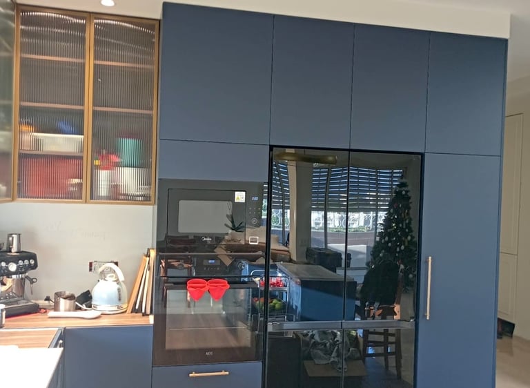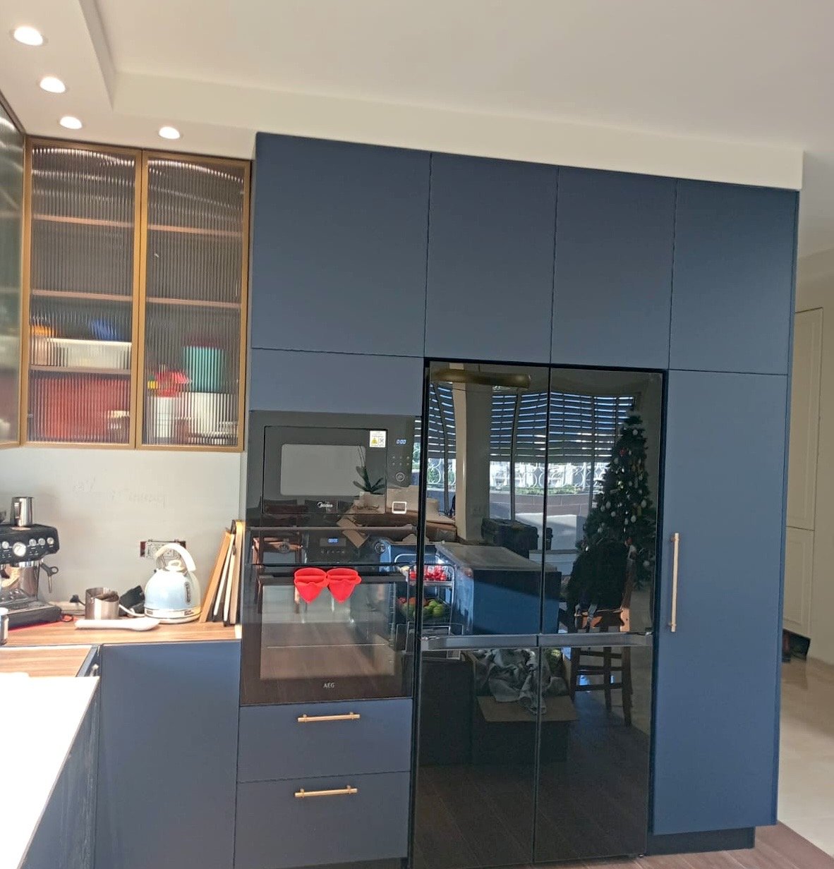 מטבח בגוון כחול כהה עם ארונות זכוכית ומלא בסטייל