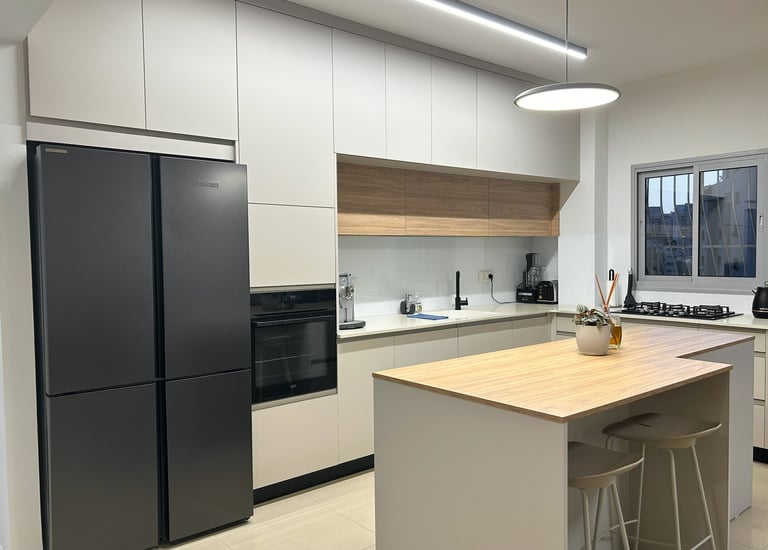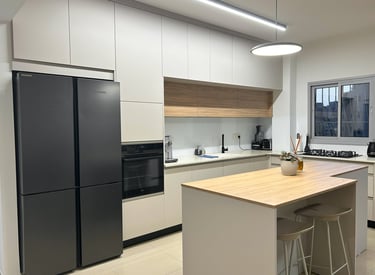 מטבח ננו אקרילי עם אי המשלב גווני סהרה ועץ בהיר.