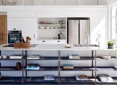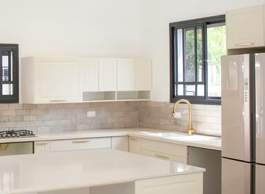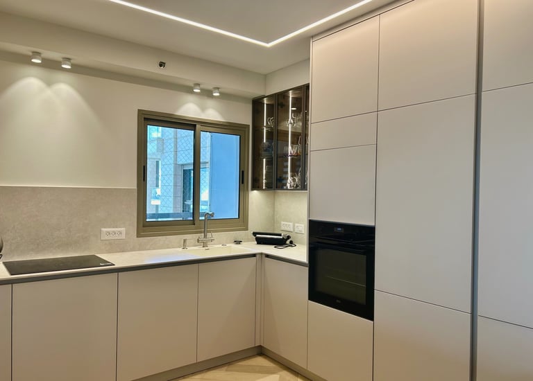 מטבח מודרני עם ארון זכוכית בגוון סהרה שהפך לגוון קלאסי בעולם המטבחים.