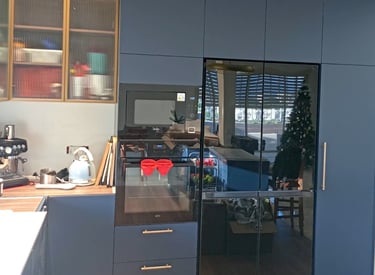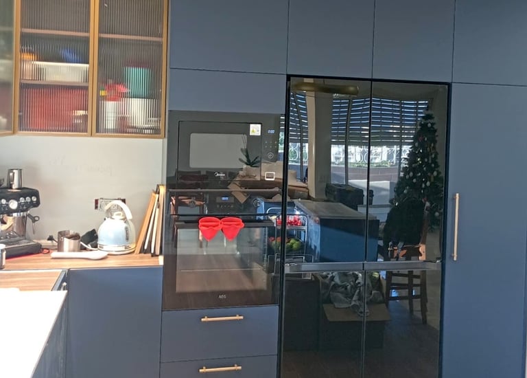 מטבח בגוון כחול כהה עם ארונות זכוכית ומלא בסטייל