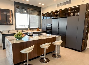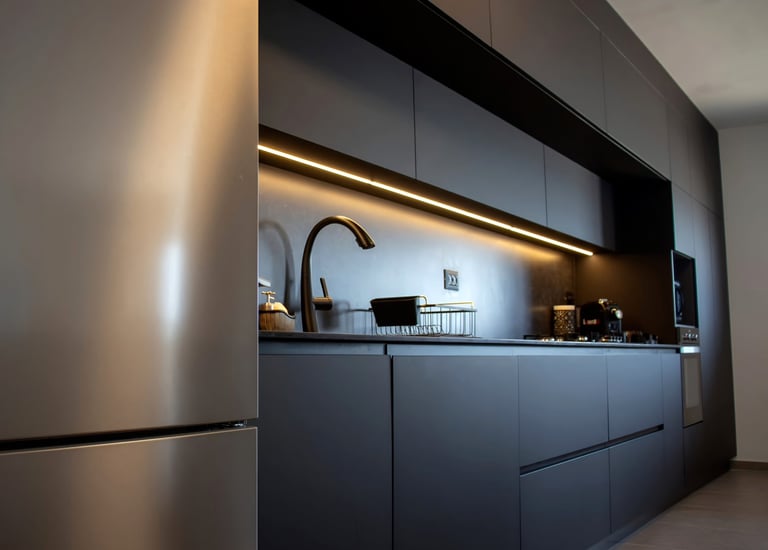 מטבח מודרני כהה שמביא מראה אורבני ודרמטי לבית.