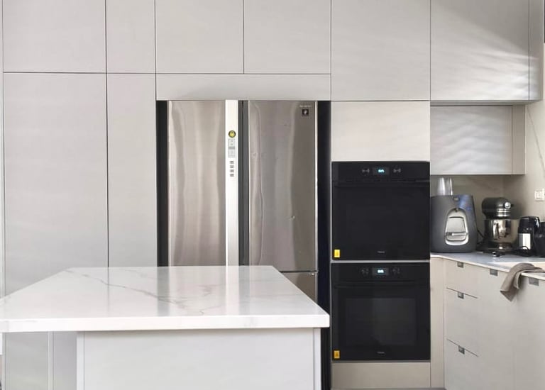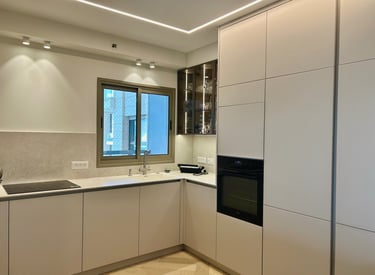 מטבח אפור בהיר, מט ומדויק ששומר על רוגע ומודרניות.
